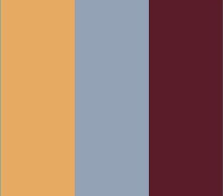 Zonnebloemgeel, dusty blauw en bordeaux.
